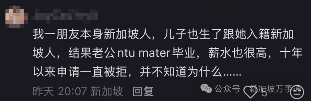 有网友表示,她一个朋友本身是新加坡人,儿子也跟她入籍新加坡了,可她老公是南大硕士,薪水也很高,十年来申请PR一直被拒,也不知道为什么...