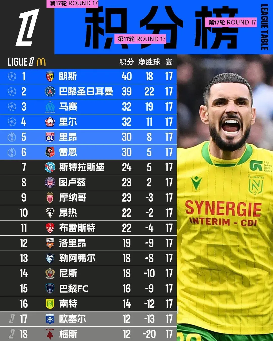 当25-26赛季法甲第17轮战罢,积分榜第一的球队足以让整个法国足坛为之侧目。成立于1906年拥有119年历史的朗斯,客场3-0横扫图卢兹豪取7连胜,正以40分领跑法甲积分榜!