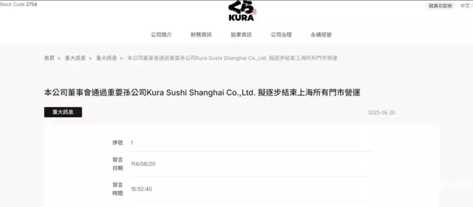 2025年6月,KURA寿司通过子公司亚洲藏寿司股份有限公司发布公告称,公司董事会考量国际经济环境变化,在评估并衡量未来整体发展后,决议拟逐步结束上海所有门店的营运,此事对公司财务业务无重大影响。这也意味着Kura寿司要退出中国内地市场。