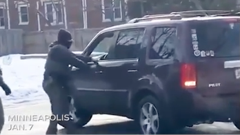 在明尼苏达州,一名执法人员继续抓住车门把手,而另一名似乎站到了车前。