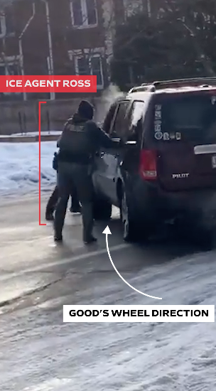 周三,在明尼阿波利斯,移民与海关执法局(ICE)特工乔纳森·罗斯在一辆车内 开枪击毙 了蕾妮·妮可·古德。旁观者拍摄的视频显示,开枪时罗斯站在车头一侧,而车辆轮胎转向远离他,车辆正向前行驶。