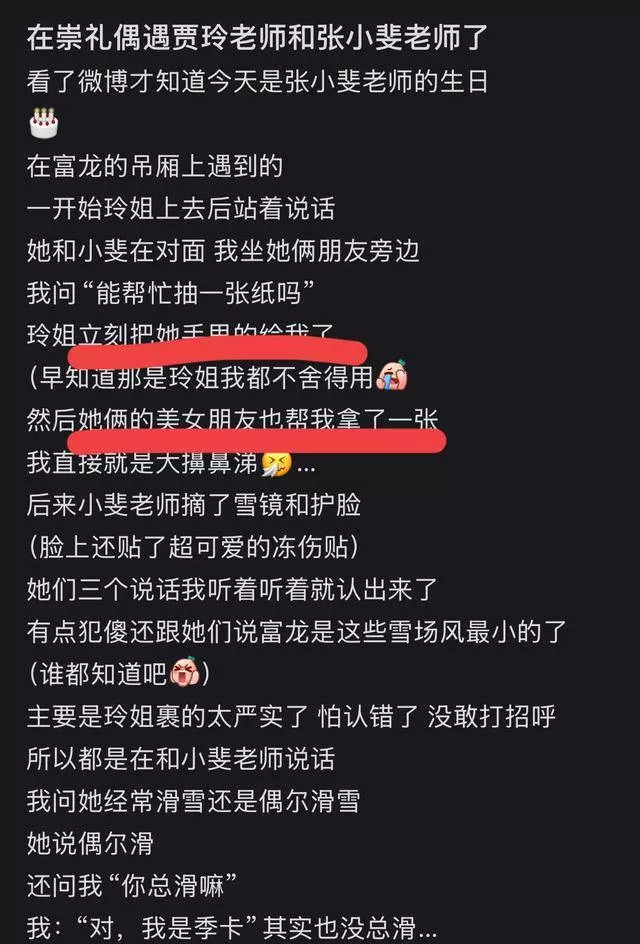 网友透露,在滑雪场吊厢上偶遇了贾玲和张小斐,她们包裹严实,但是很亲切。贾玲还给网友拿纸巾,张小斐则跟网友聊天,俩人都一点架子都没有。