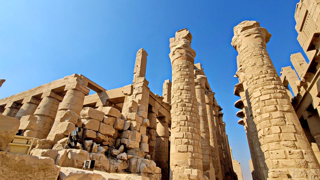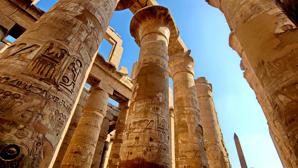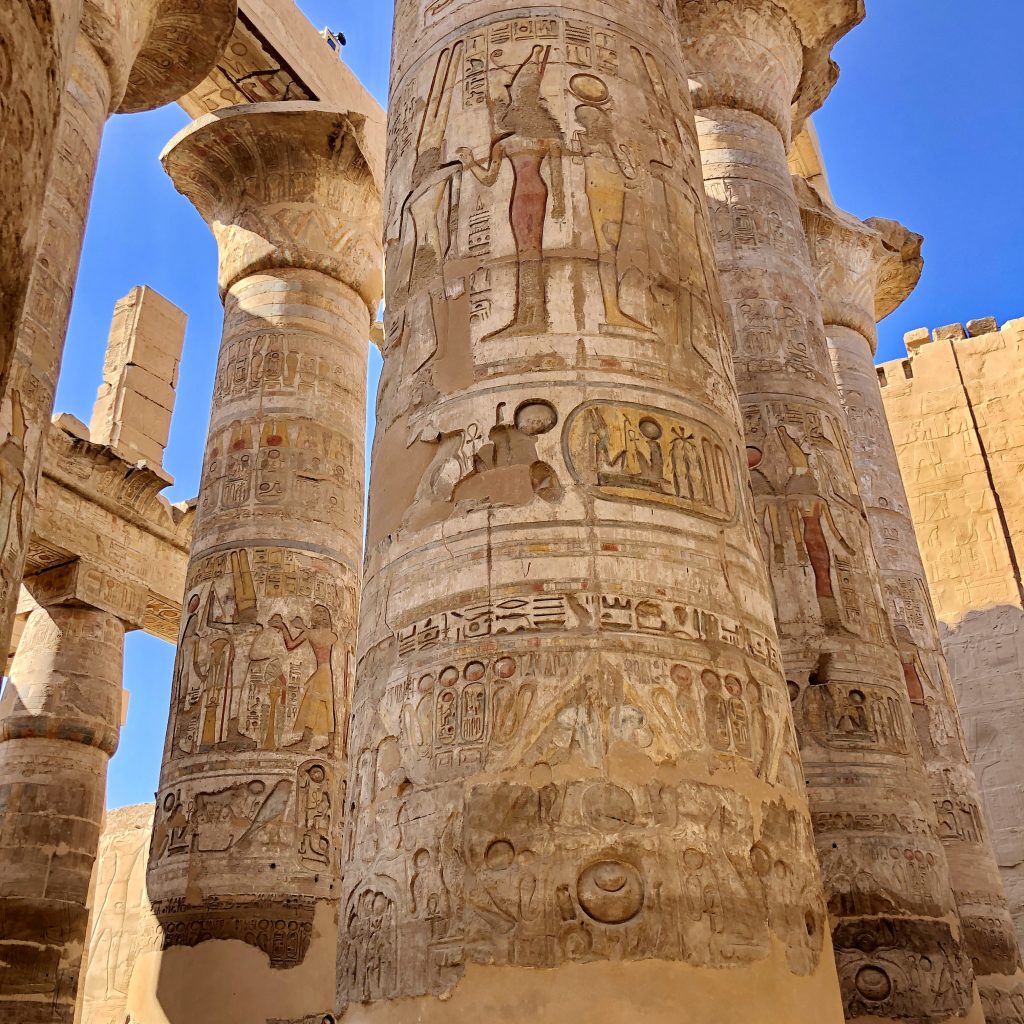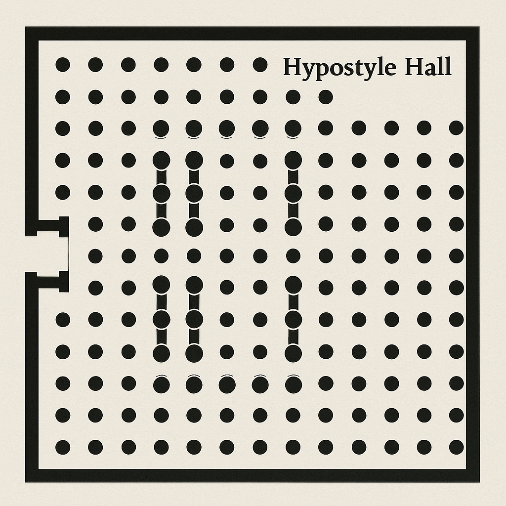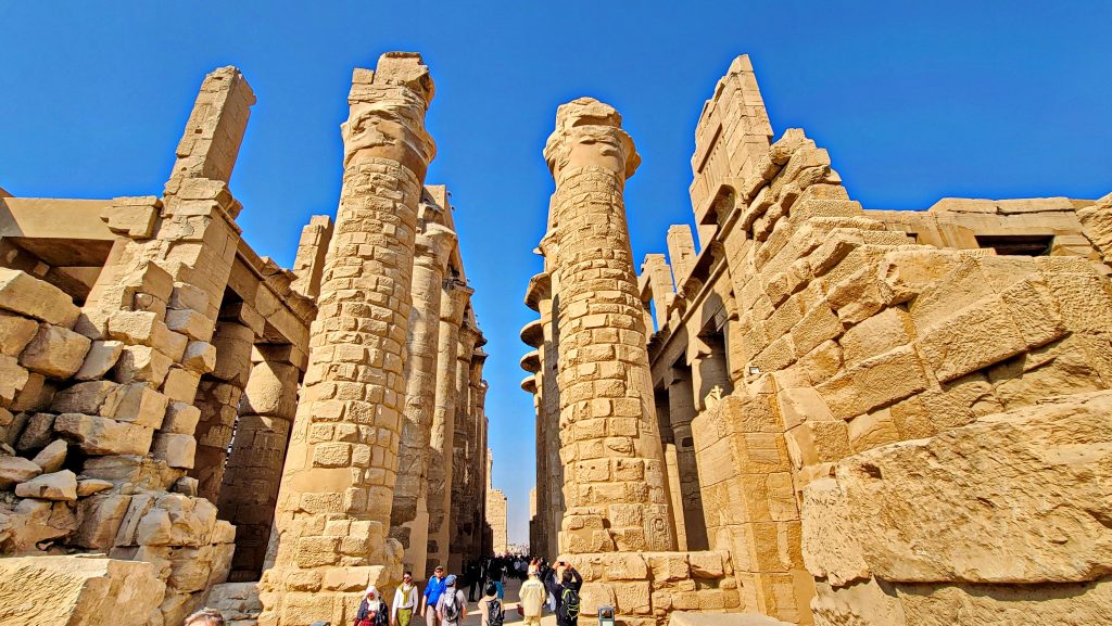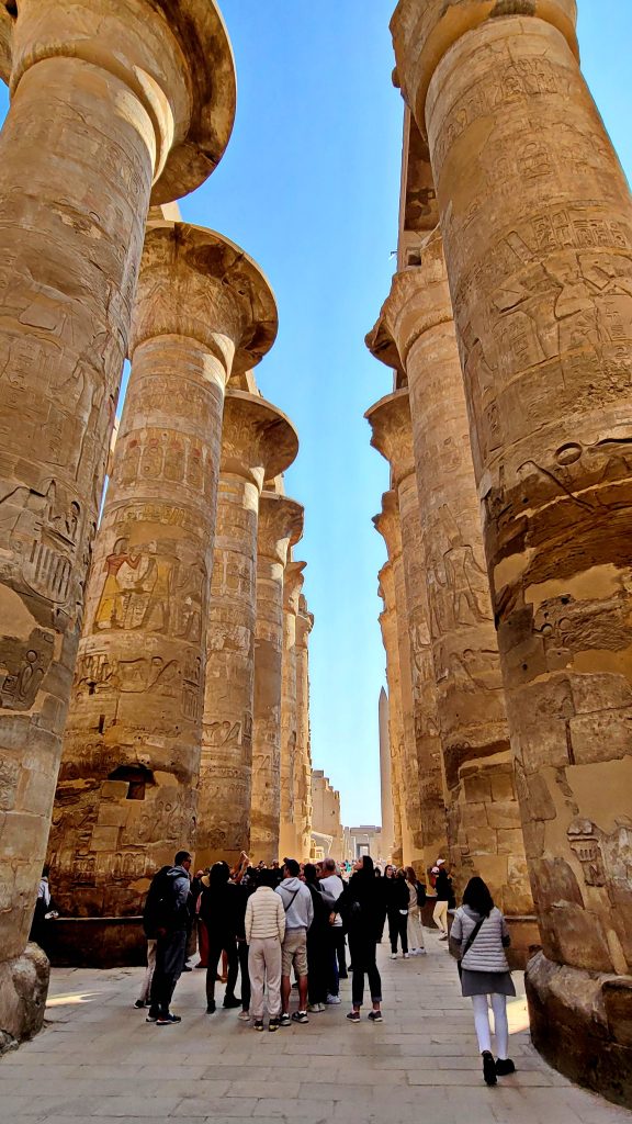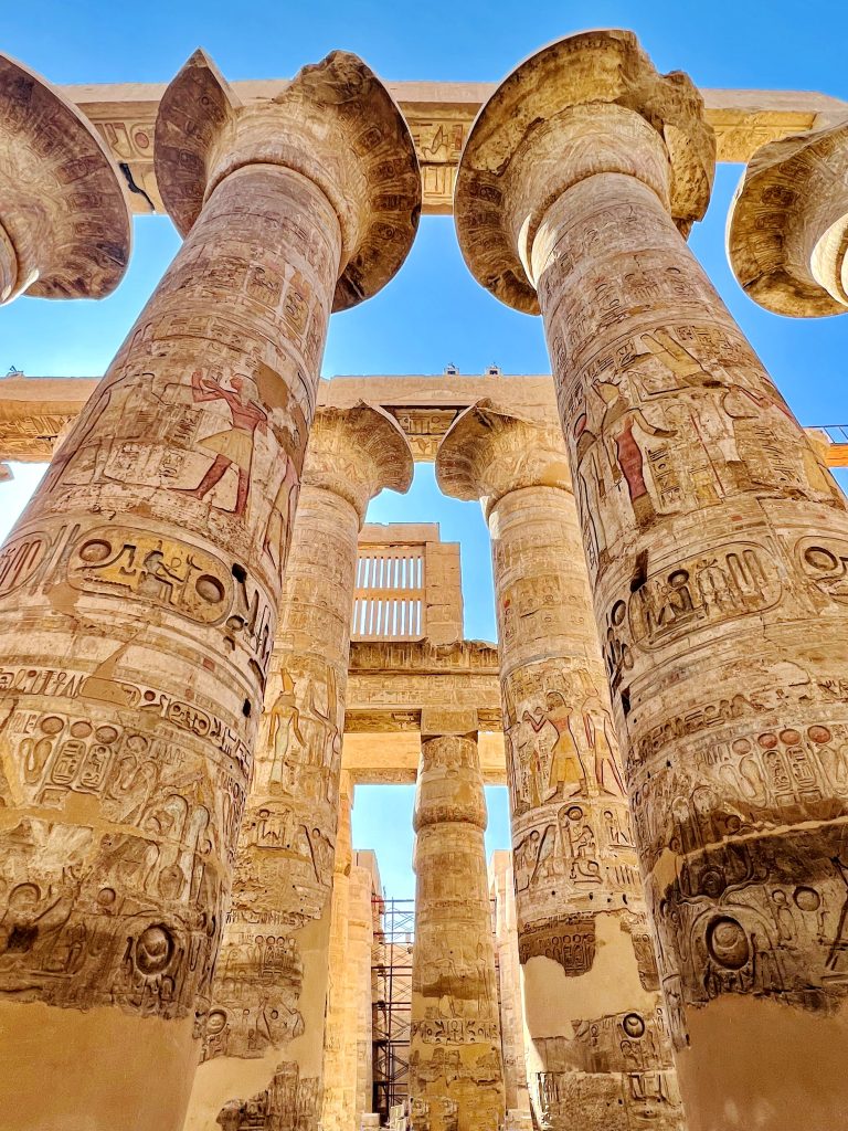 是古埃及建筑艺术的巅峰之作,位于主神殿的中央区域,占地约5400平方米。厅内矗立着134根巨大的石柱,其中中间12根高达21米,顶部为纸莎草花式柱头,其余柱子也高达10米以上。这些石柱密集排列,气势恢宏,仿佛一座“石之森林”。柱面上布满了精美的浮雕和象形文字,记录了法老如塞提一世、拉美西斯二世的战功与宗教仪式。阳光透过高窗洒入,使大柱厅光影变幻,神秘庄严。