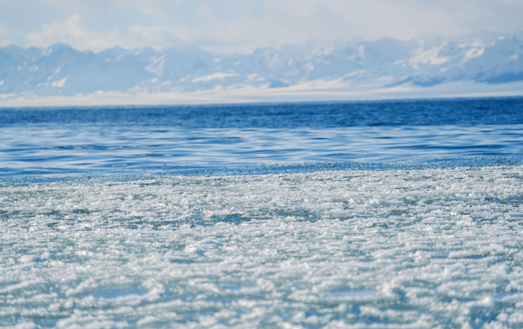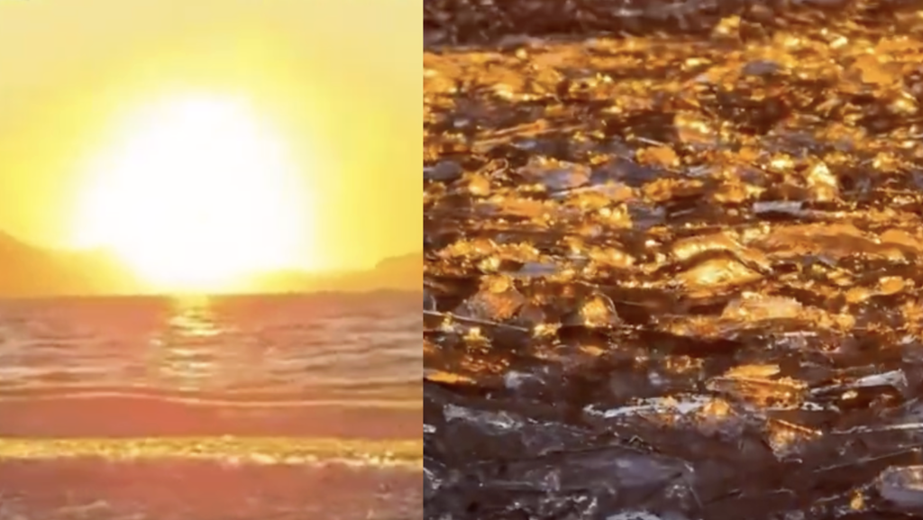 大陆新疆赛里木湖近日出现绝美风景,低温气候让湖面结冰形成冰推,晚霞日落光影打在冰推上,配上水面碧波,一种贵气的龙麟跃金呈现在眼前,令人赞叹大自然的鬼斧神工。