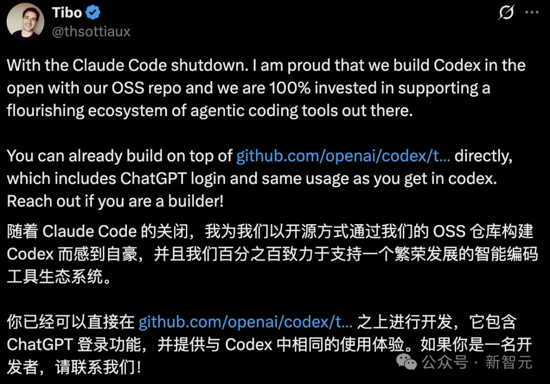 OpenAI的Codex工程负责人Thibault Sottiaux(网名Tibo)更是不失时机地推销起自家agentic coding tools(智能代理编码工具)生态系统的开放性。
