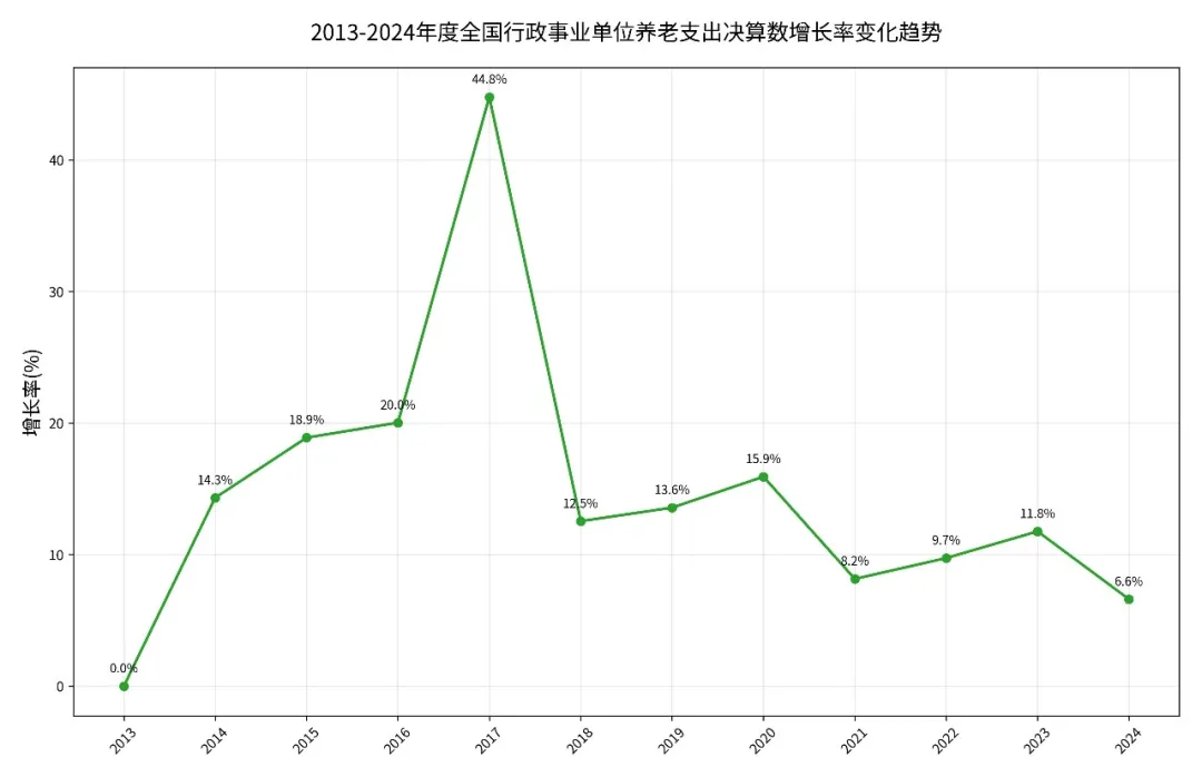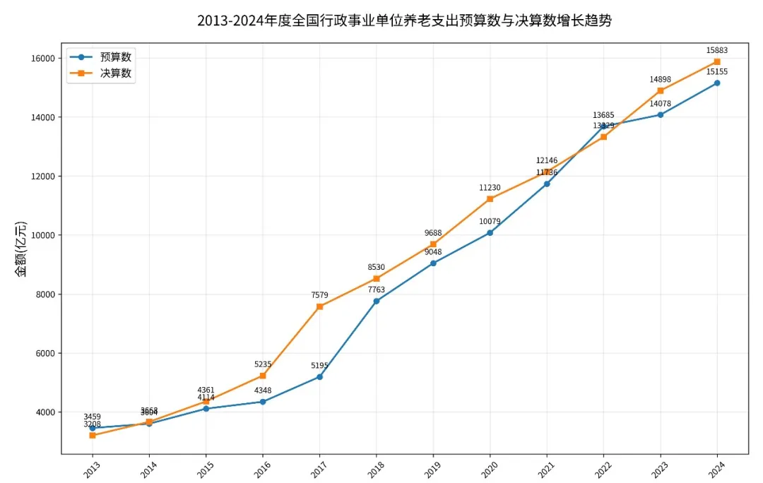 2013年至2024年期间,体制内退休金预算数增长了约4.4倍,决算数增长了约4.9倍。