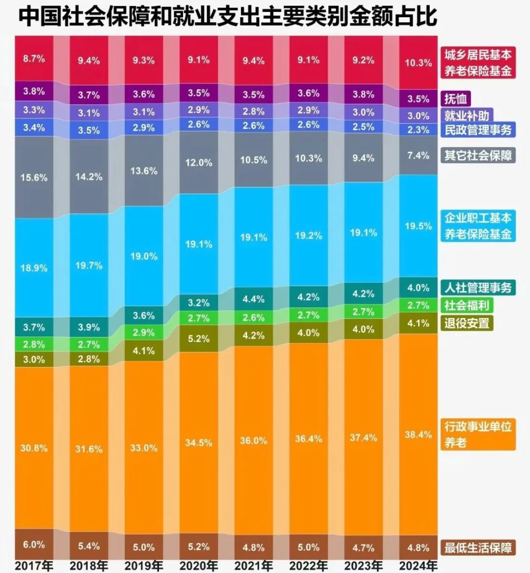 在此期间,行政事业单位养老的占比从2017年的30.8%一路上涨至2024年的38.4%;而其他社会保障类却恰恰相反,从2013年的15.6%逐年下跌至2024年的7.4%。