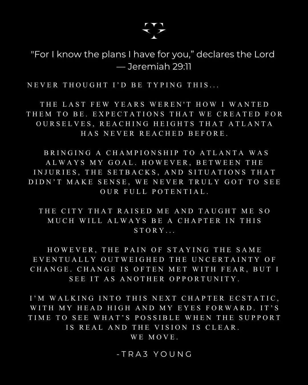 为亚特兰大带来冠军一直是我的目标。然而,在伤病、挫折和种种难以理解的困境之间,我们从未真正看到自己全部的潜力。