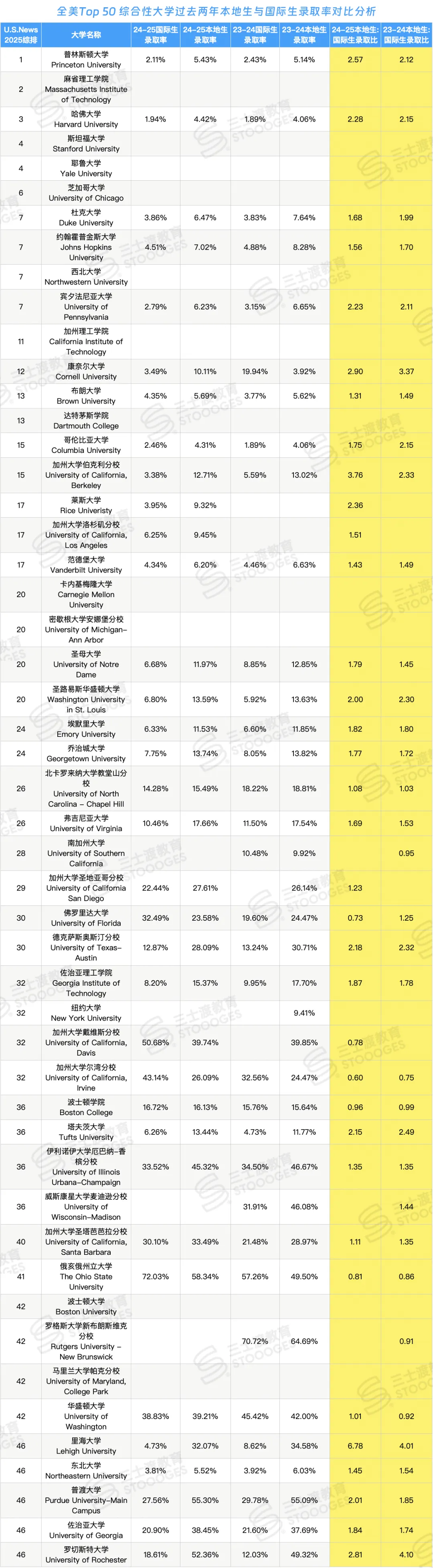 👇全美Top50综合性大学过去两年本地生与国际生录取率对比