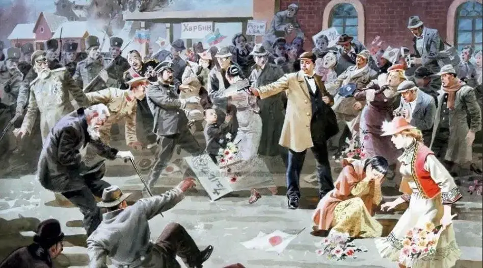 1909年10月26日,在中国东北的哈尔滨火车站,前来与俄国使臣会谈的伊藤博文被安重根刺杀身亡。安重根完成使命后,并未逃走,而是在众目睽睽之下,由怀里掏出一面韩国国旗,双手展开,那青红色的太极旗上用鲜血写着“独立自由”四个大字。当几个俄国士兵扑上去将他扭住时,他连呼三声“大韩独立万岁!”,从容就缚。