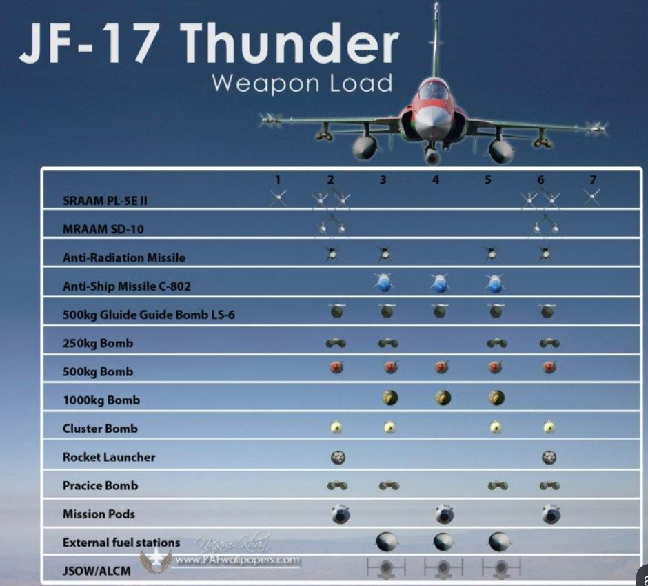 在制空作战中,JF-17“枭龙”Block III可在有源相控阵雷达与头盔瞄准具的支持下,搭载超视距及近距格斗导弹。据报道,兼容武器包括: