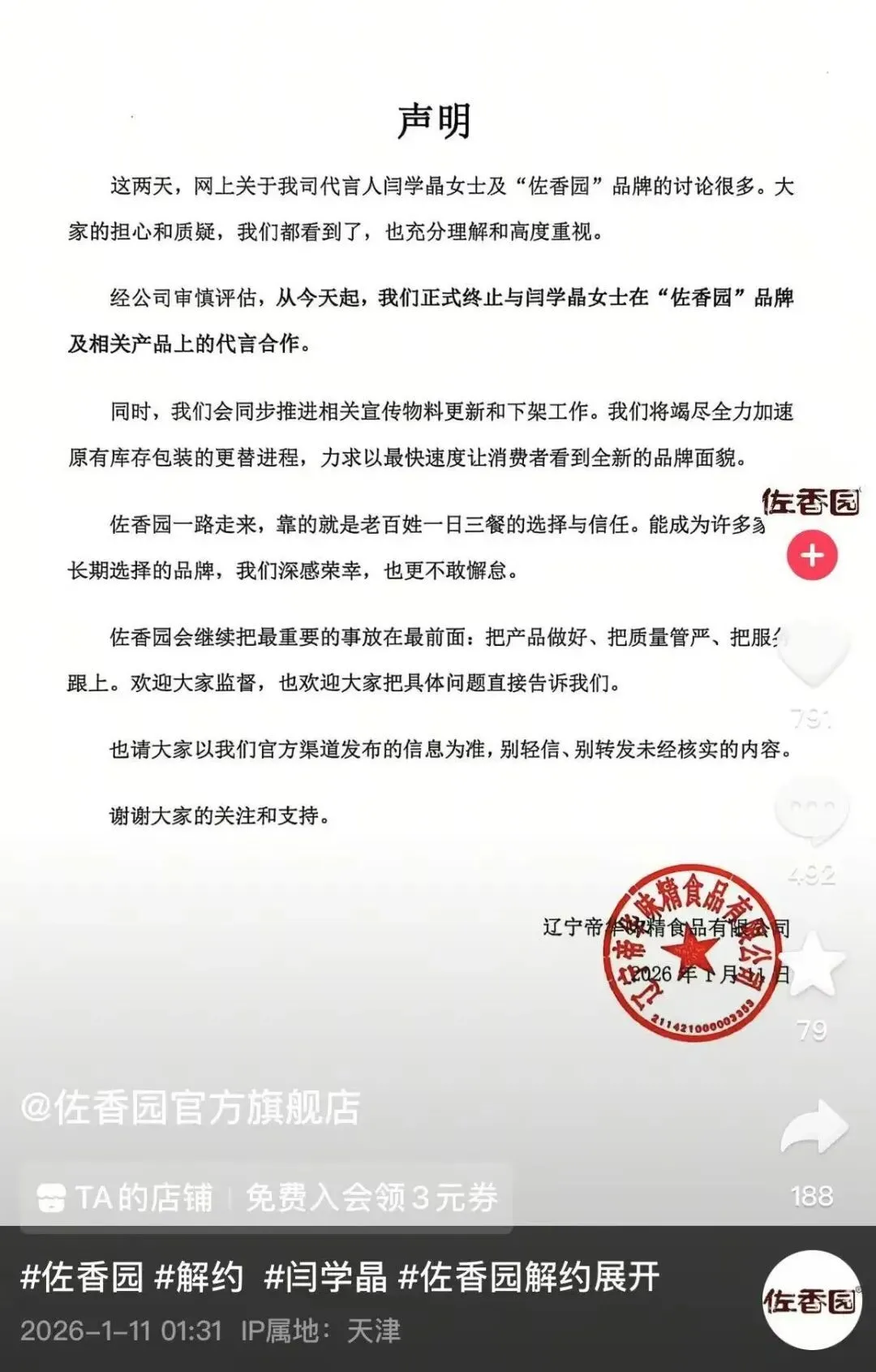 经公司审慎评估,从今天起,我们正式终止与闫学晶女士在“佐香园”品牌及相关产品上的代言合作。