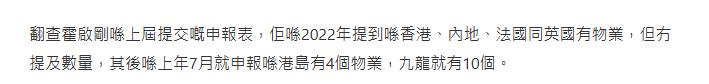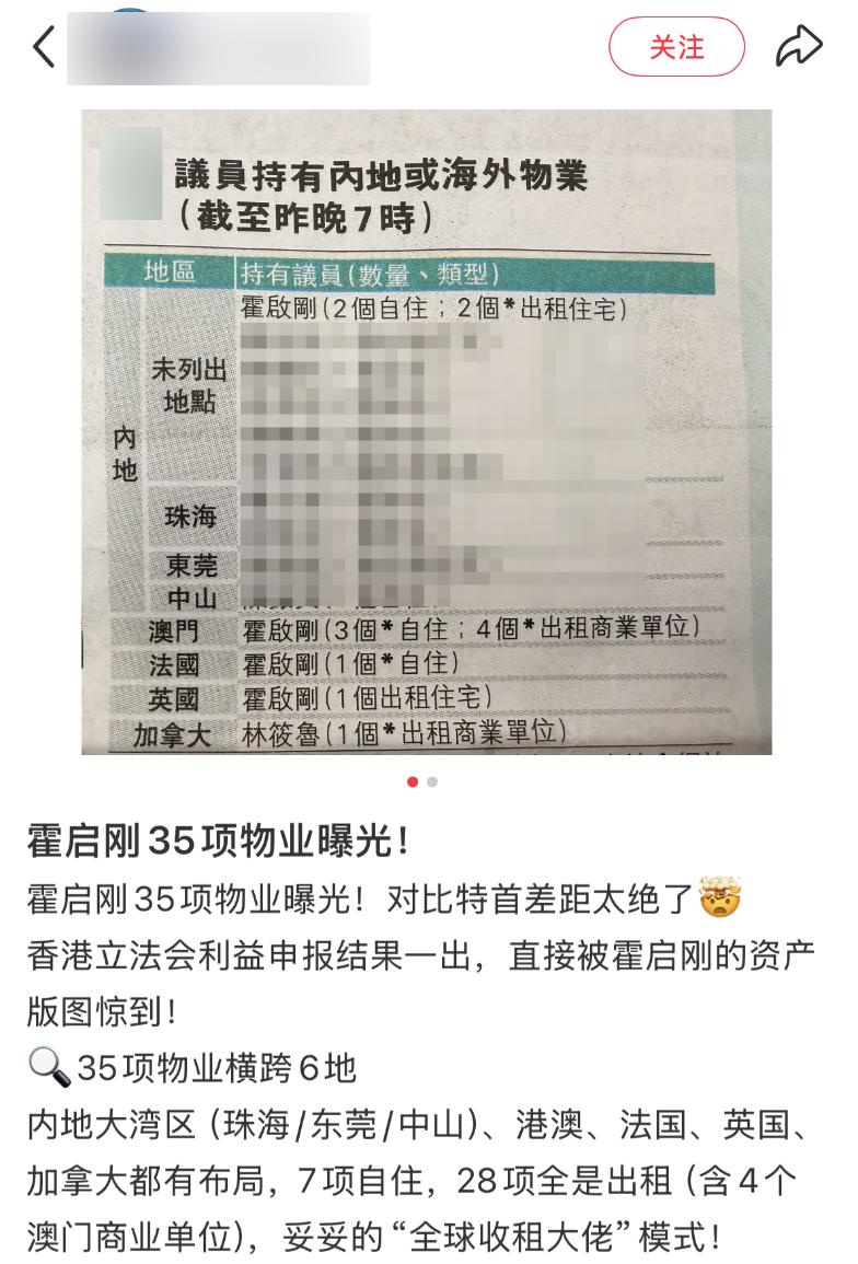 有网友分享了港媒的报道,报道刊登了霍启刚物业详情,其中在内地有4套房产,两套自住两套出租,然后在澳门有七套房产,三套自住四套出租。