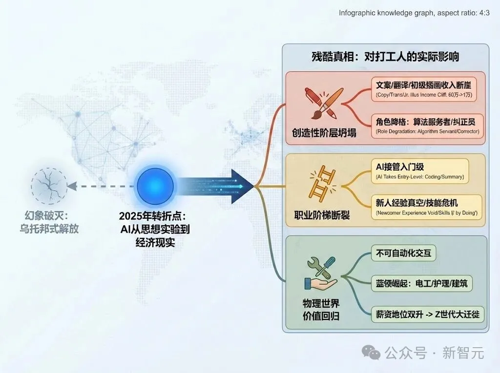 ChatGPT发布三年后,第一批被AI「干掉」的打工人出现了!由于AI,整整一个行业正在原地消失,从年薪70万跌至几千块,当入门级职位被系统性抹除,年轻人面临毕业即失业,同时蓝领工人却正在崛起。2025年终盘点:AI是如何重写人类就业规则的。