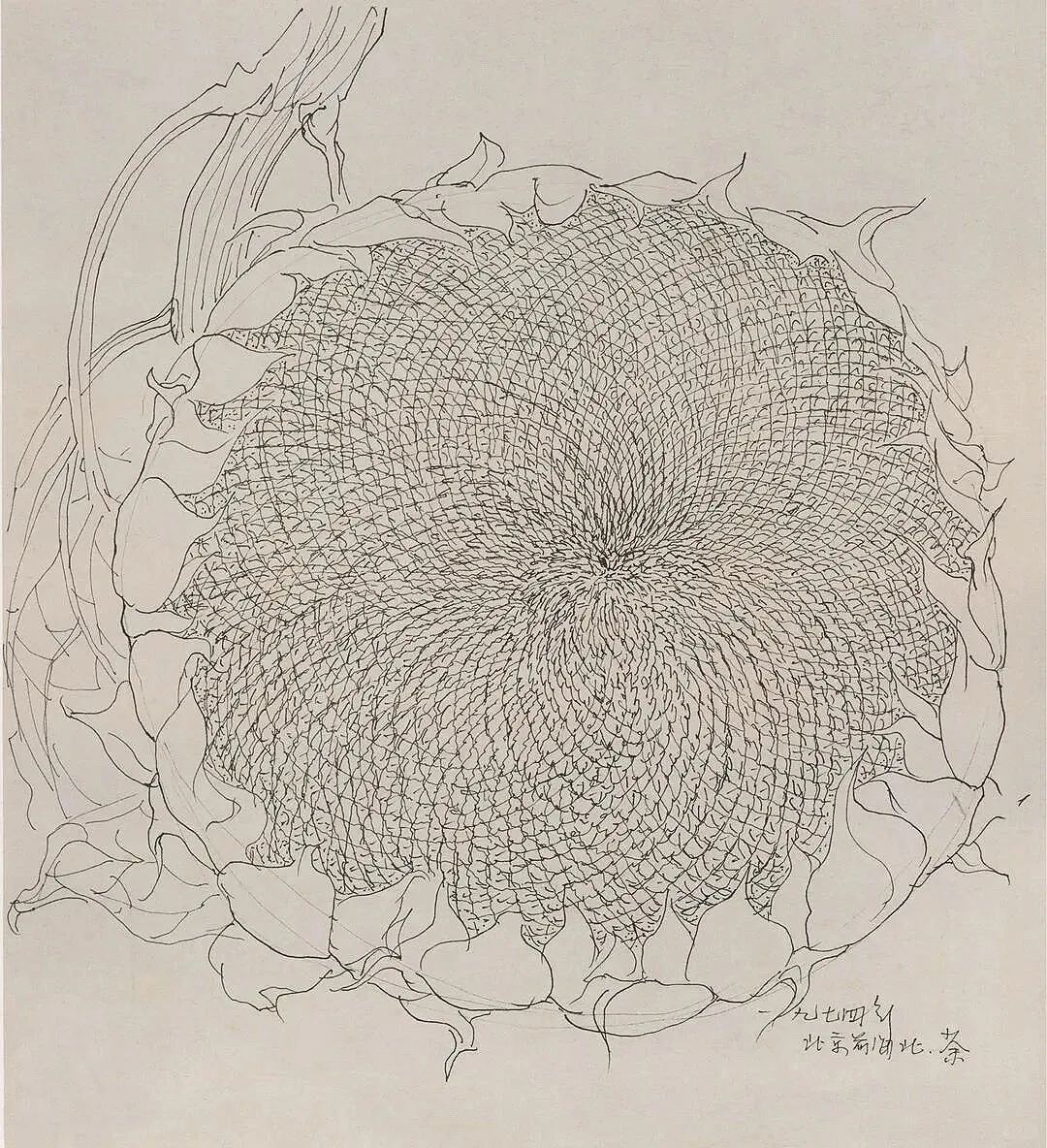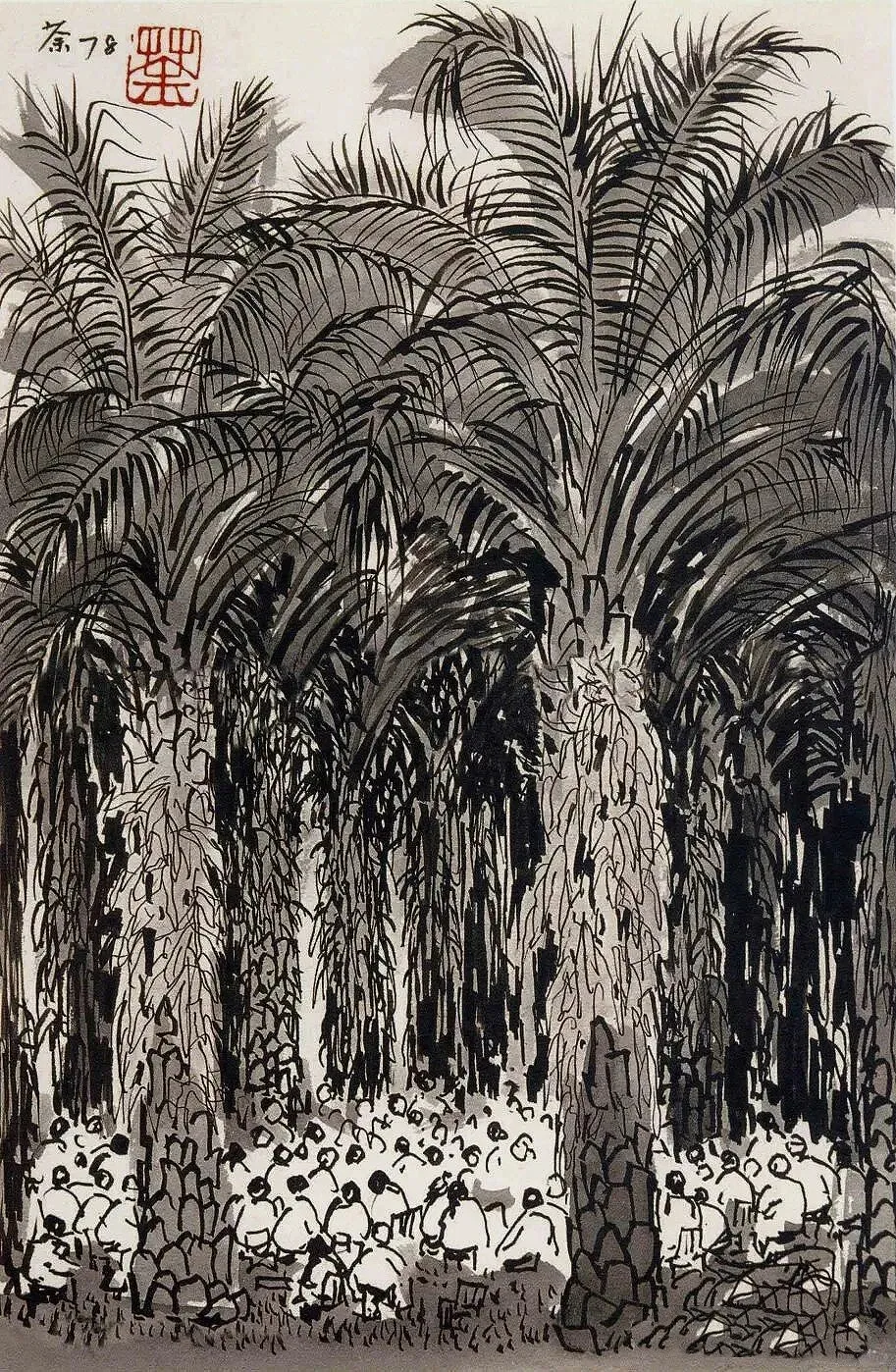 当下艺术圈总有人追着“复杂”跑,堆细节、炫技法,恨不得把画布塞得满满当当,结果作品空得像没灵魂的摆设——这不就是我们常说的“假大空”吗?反观吴老的画,一根线条就能撑起整幅画面的生命力:椰树的舒展苍劲,老槐的虬曲沧桑,白桦林的疏朗空灵,甚至向日葵花盘的螺旋纹理,都只用极简的笔墨勾勒,却比满纸繁复更戳人。
