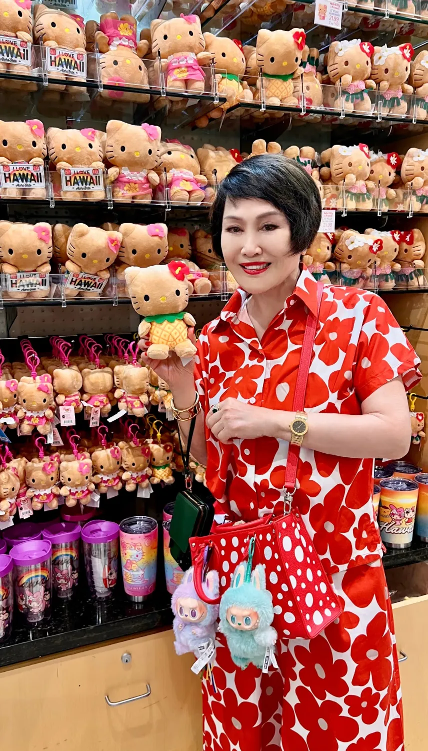 旅行之外,她不仅能熟练地使用AI制作短视频,还会像个小女孩一样,在夏威夷为了买到一只心仪的黑皮Hello Kitty而雀跃不已,而包上则挂了两只这半年来很火的labubu。