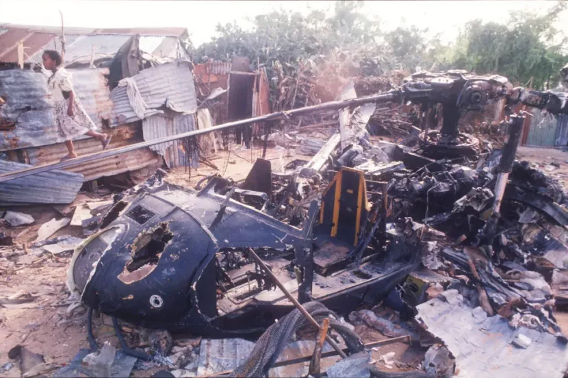 在1993年的“哥特蛇”行动中,被索马里民兵击落,坠毁在摩加迪城区的美军“黑鹰”直升机。