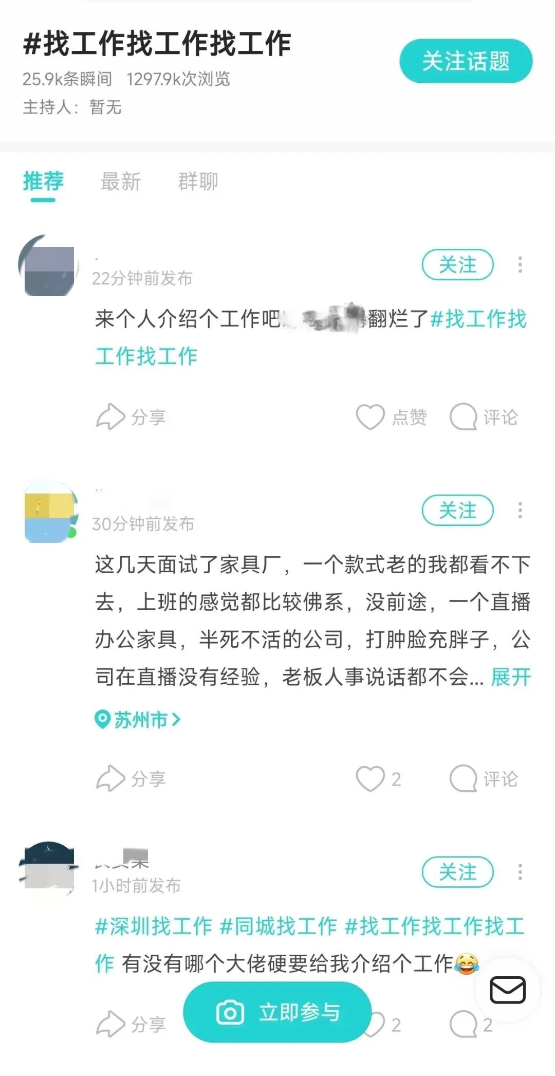 在这些APP的“找工作”相关话题下,聚集了许多求工作的人。