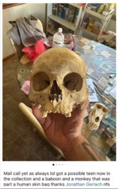 Facebook一个名为“人骨和头骨出售”群组有网民留言,感谢34岁疑犯格拉克(Jonathan Gerlach)出售的“人皮袋”。(网上图片)