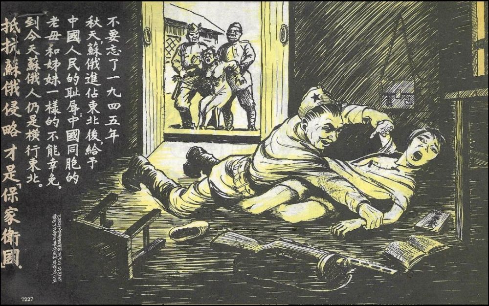 记得是 1945 年 10 月间,我们南塔村闯进来一名骑着洋马的苏联红军,他挨户踅摸,最后闯进王升老两口的家,要强奸女主人。王升反抗,这个俄国毛子就操起一个大洋酒瓶子,几下子把老头打死,继而抓弄老太太。老太太叽哇喊叫,惊动了四邻。我们村有一家姓蔡,有九弟兄。大家闻声扒窗户往里看, 见鬼子正在干坏事,蔡家兄弟就破门冲入,一顿棍棒把作恶的鬼子打死,解救了老太太,可是老头已经死去。