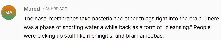“鼻粘膜会把细菌和其他东西直接送入大脑。之前有段时间流行过用鼻子吸水,人们把这视为一种‘清洁’方式,结果感染了脑膜炎和脑部变形虫等。”