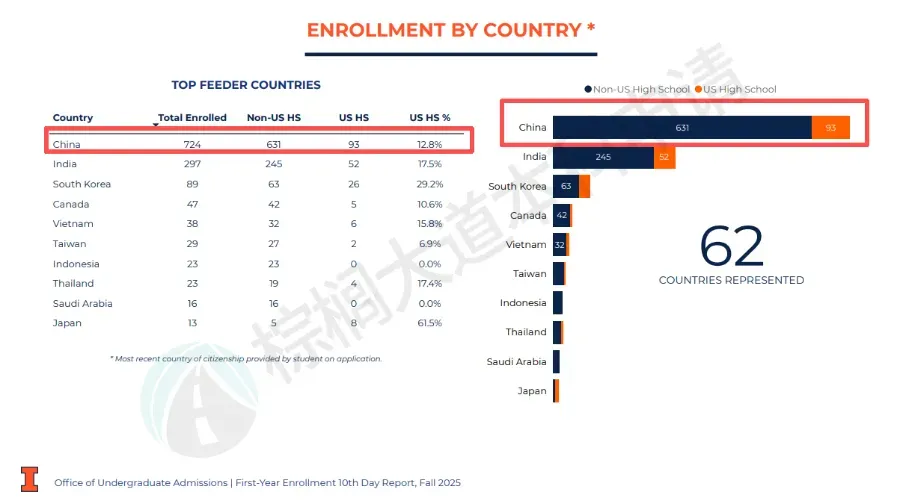 据官方最新发布的2029届新生入学数据:本科入学新生中,中国学生共724人,占UIUC国际生总人数的50.45%。截至2025年秋季,校内中国学生总人数共约6,033人,创历史新高。