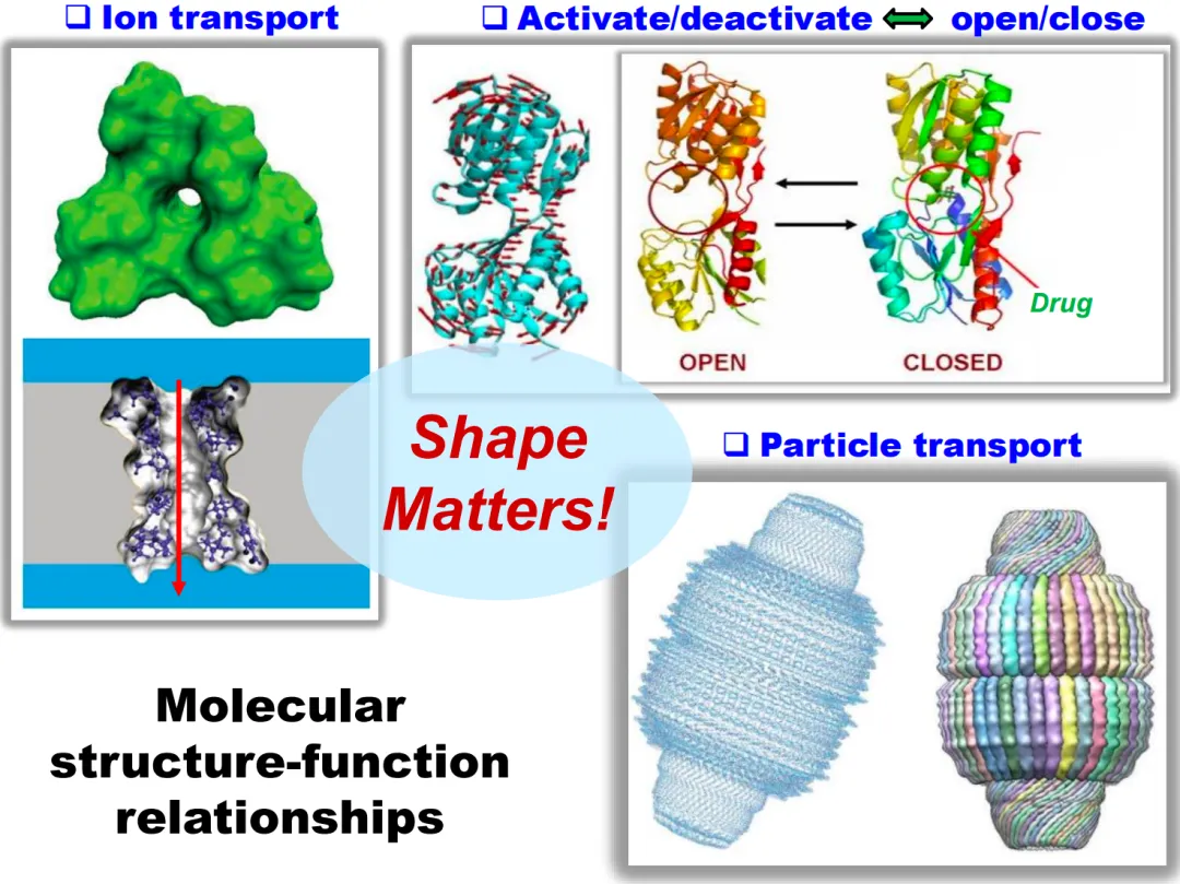例如,离子通道蛋白质的显著特点是它们中心有一个洞(图4左上),这个洞对离子通道的功能至关重要,因为它方便了细胞膜外部的离子进入膜内,或者膜内的离子离开细胞。另一个例子是蛋白质笼(图4右下),这种蛋白质的表面有一定结构,但其内部是空的,就像用来装东西的盒子,这种空心的结构有利于某些物质的存储和运输。最后一个例子是具有两个固定区域,并通过一个灵活连接区域相连的分子。这种结构可以形成一种开关状态,使得分子能够处于激发态或非激发态,从而影响其功能。