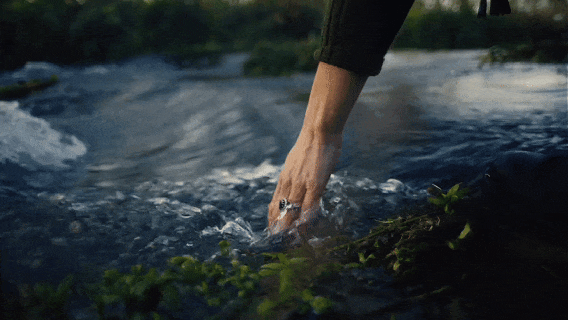 她缓慢走在雪地小径上、穿过木桥、停下来把手浸入缓缓流动的溪水中,静静凝视水面倒影。