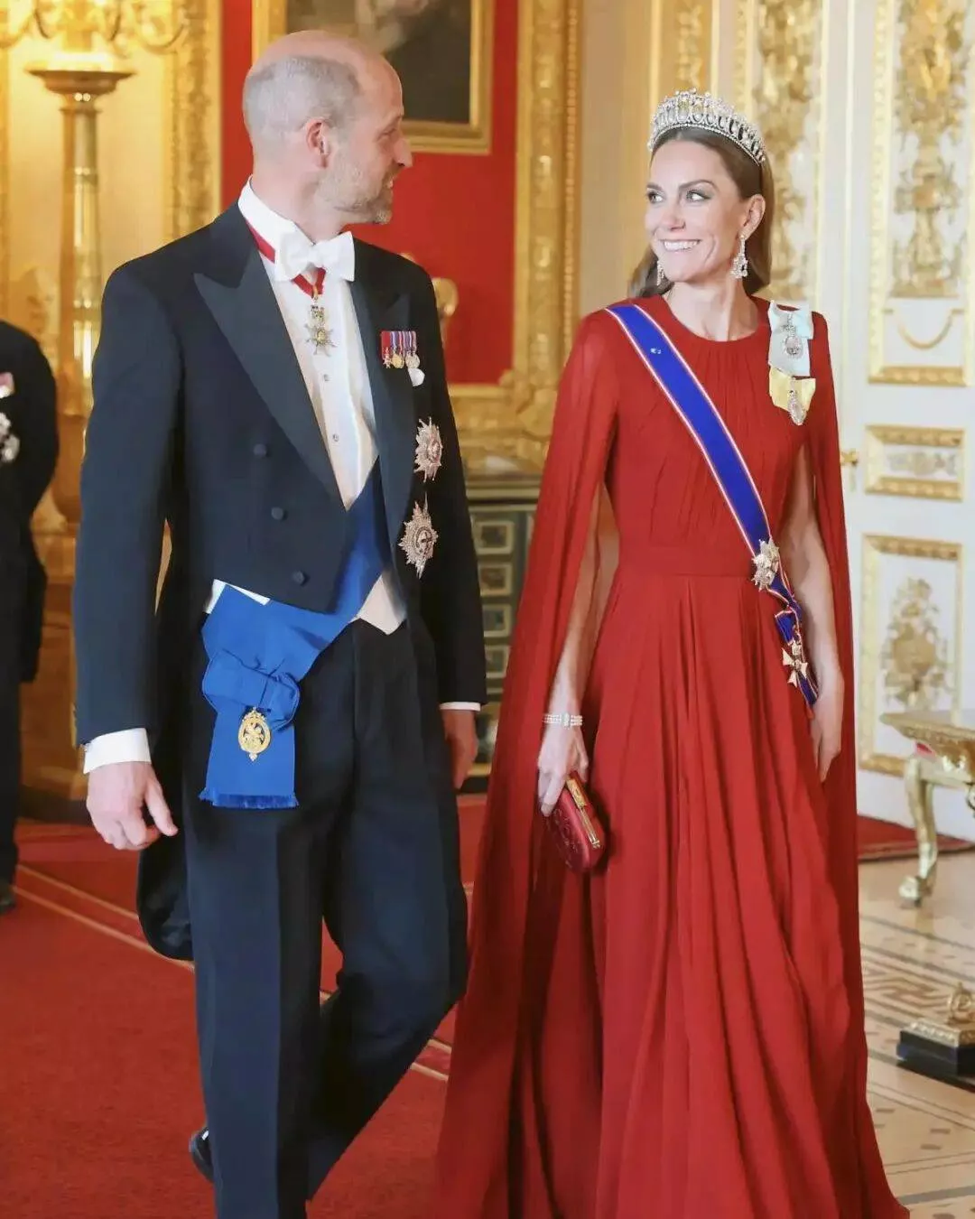 出席欢迎马克龙的国宴时,也戴了这顶冠冕,由Sarah Burton for Givenchy设计红色披肩礼服超霸气。