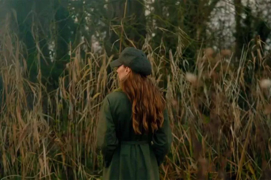 站在田野或林中,抬头望向天空或低头观察自然细节的身影,配上“学会与眼泪和解,并发现活着的真正含义,与大自然合而为一”。