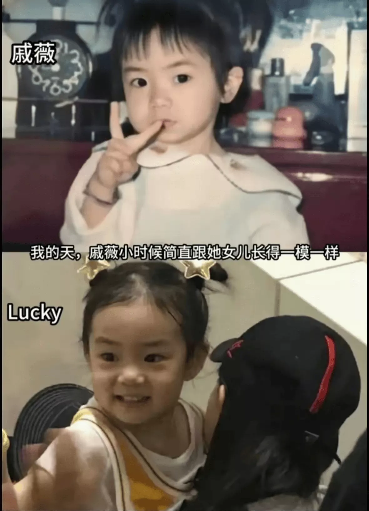 再回想一下,Lucky小时候长什么模样。一双眼睛又大又圆,皮肤更是白白净净的,简直就和戚薇小时候一模一样。