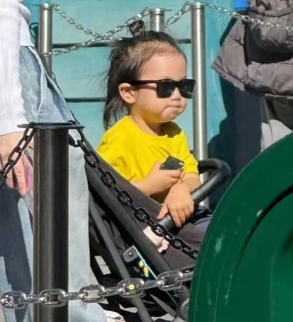 现在李承铉和儿子都剪了短发,看起来清爽多了。别说李承铉这个颜值,不管头发是长是短都很帅气。他穿一身黑衣,戴着墨镜,超级酷。