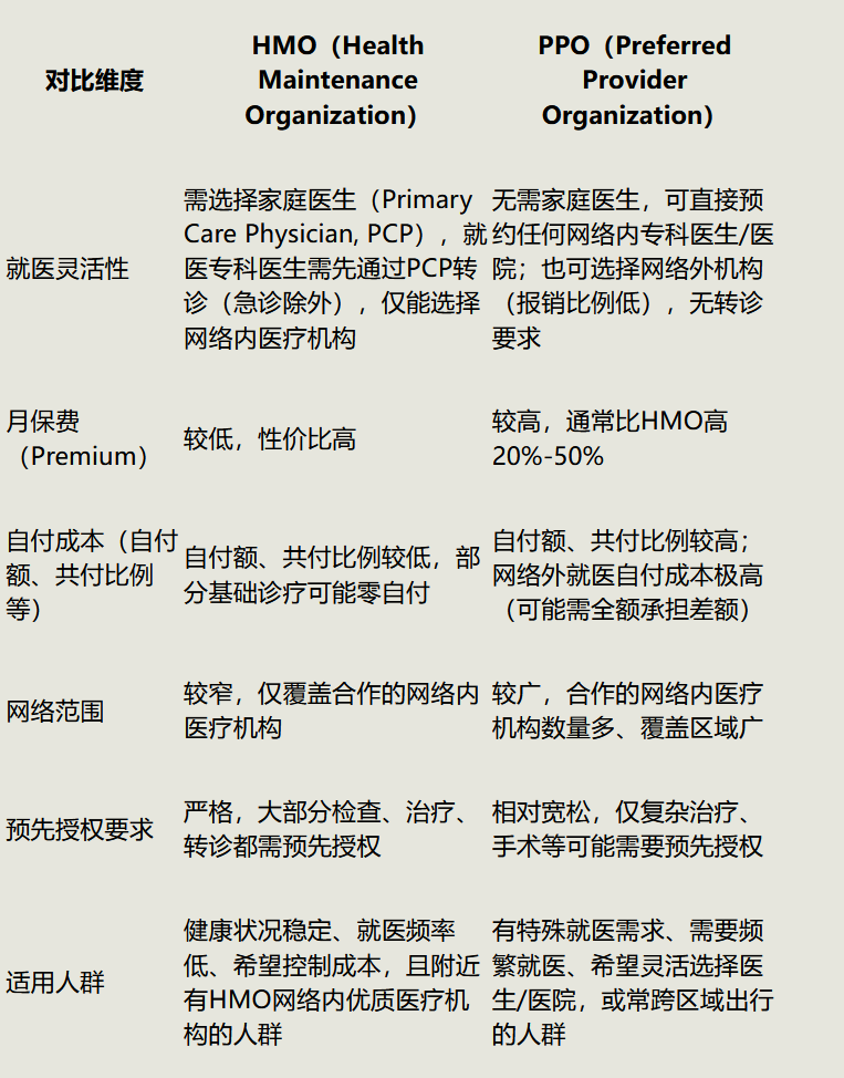 HMO(健康维护组织)和PPO(优选提供者组织)是私人医保中最常见的两种计划,核心差异体现在就医灵活性、成本等方面,具体对比如下:
