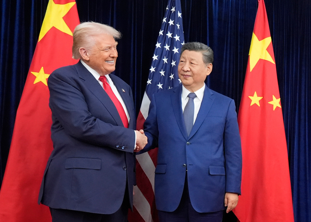 4月北京行对川普(左)尤为重要,因为11月大选成败相当程度取决于此行的成果。 图为川普、习近平(右)2025年10月30日在韩国釜山会晤。 (美联社)
