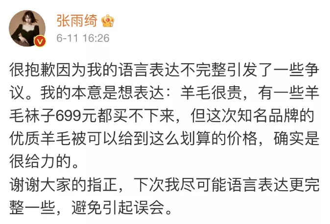 再之前,张雨绮在参加的一场带货直播中,面对一款699元的羊毛被贡献了自己新的金句:“699,我觉得都买不了个袜子呢。”这番话可把现场主持人吓得够呛。毕竟对于大多数普通人而言,根本不会花699元去买一双袜子。69.9元一双,笔者本人都嫌贵。