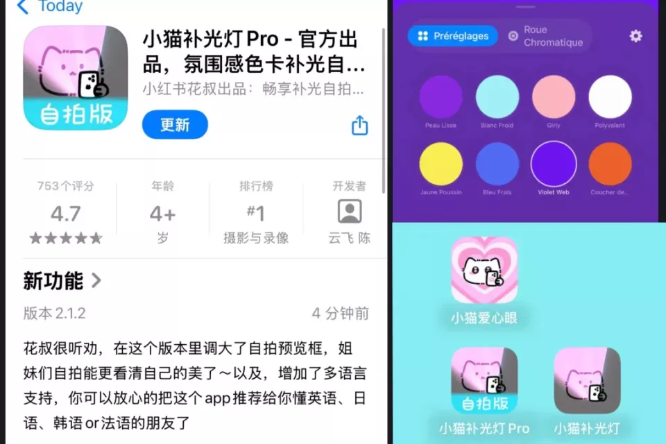 在“死了么”之前,还有一个叫“小猫补光灯”的APP。它的功能也极其简单:用前置摄像头自拍时,把屏幕调到最亮并更换不同颜色的光线。一个几乎不会写代码的男生花了一天时间做出它,以1元的售价发布在苹果应用商店,不到一年收获百万下载。