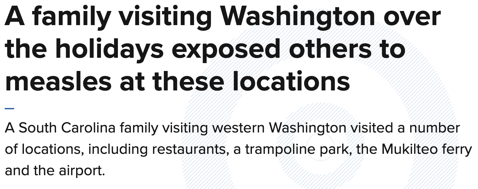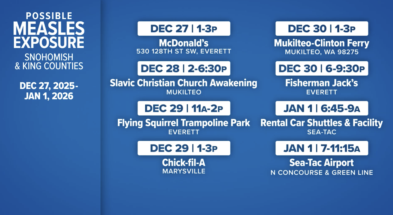 据1月9日报道,华盛顿州金县与斯诺霍米什县卫生部门近日联合发布紧急通报,一户来自南卡罗来纳州的家庭在节日期间到访华州期间,已确认三例麻疹确诊病例,引发公共卫生部门高度关注。