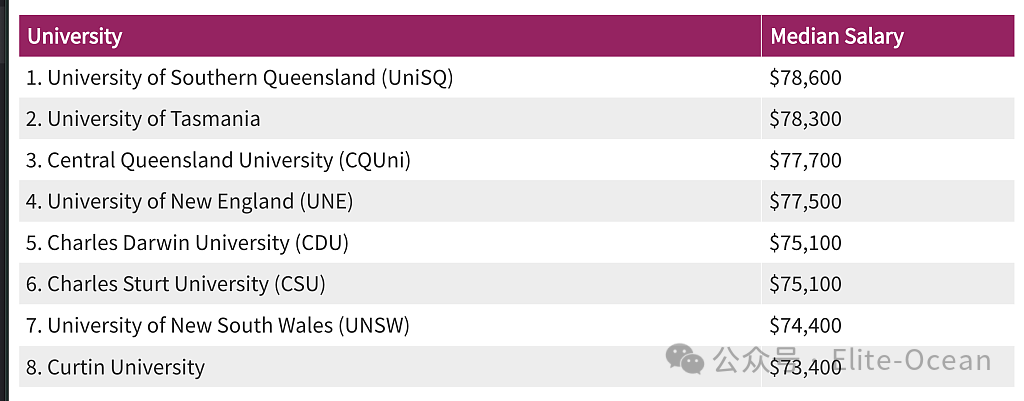- 南昆士兰大学(University of Southern Queensland)以78,600澳元的中位薪资位居全国第一