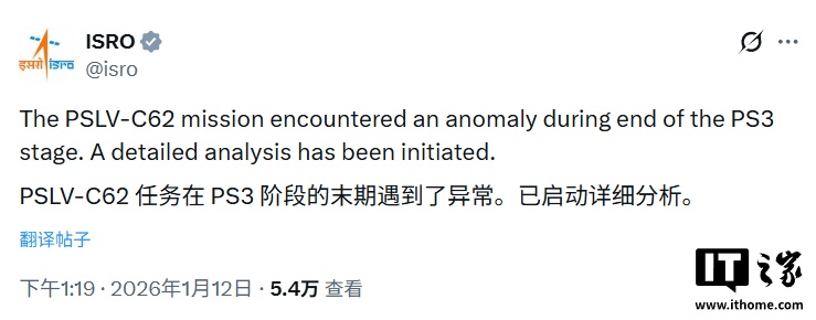 IT之家1 月 12 日消息,据新华社援引印度媒体报道,印度 1 月 12 日进行的由极地卫星运载火箭搭载的多卫星发射任务在升空后出现异常,火箭轨道出现显著偏差。印度空间研究组织随后确认卫星发射任务正式失败。