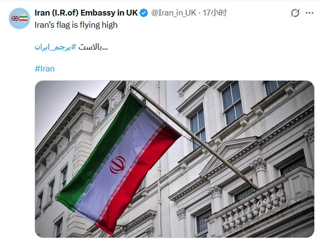 事发几个小时后,伊朗驻英国大使馆在X平台上发布了一张国旗重新升起的照片,并配文称:“伊朗的国旗高高飘扬。”