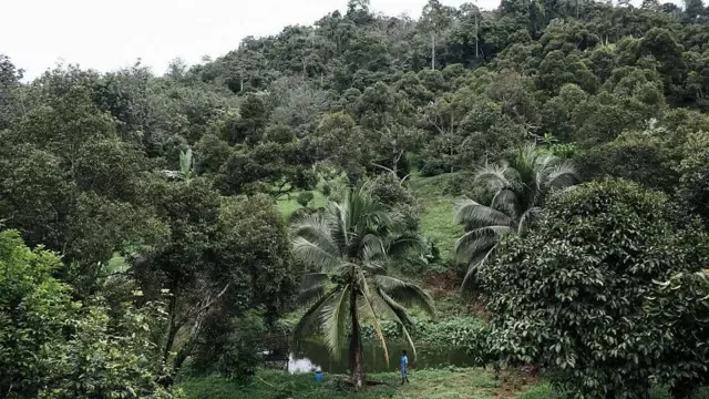 但务农终究是苦差事。72岁的丁叔每天破晓即起,在起伏的山坡间穿梭采收成熟的榴梿——有的还挂在树上,有的则落在接网中。几年前,一颗坠落的榴梿砸中他的肩膀,至今疼痛仍偶尔发作。