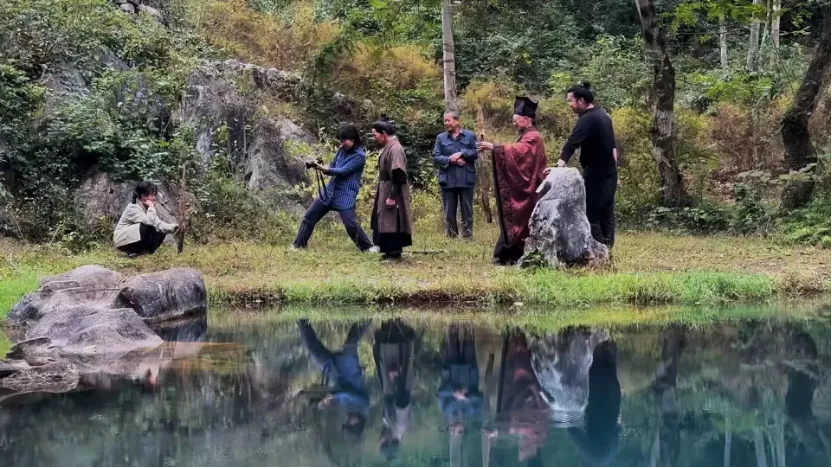 剧本定下来,就是每周排练两次。然后我自己花钱去给大家租服装,买那种古装剧用的头套,取景就在小镇附近的山上、溪边,条件也很简陋,花了一年多时间好不容易拍完、剪完。