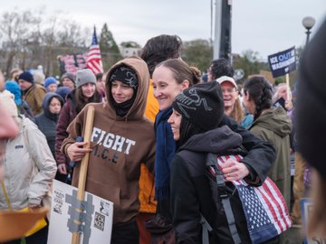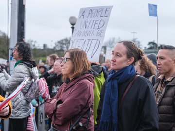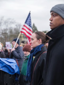 信念一致的集会人群手持标语聚集在一起。Alaron Lewis表示:“我想保护我的邻居们,无论他们是否拥有合法身份。我居住在西雅图南部地区,那里有很多移民家庭,我希望他们在这座城市中能感到安全。”