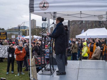 新当选的西雅图市长凯蒂·威尔逊(Katie Wilson)在卡尔·安德森公园(Cal Anderson Park)向参加“ICE永远滚蛋(ICE out for Good)”集会的群众发表讲话。她表示:“今天,我很荣幸能与大家并肩而立,共悼逝者、共表团结、共同抗争。”