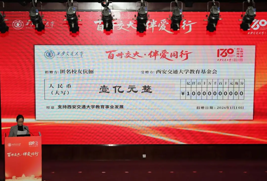 1月10日,西安交通大学“百卅交大·伴爱同行”捐赠仪式在兴庆校区举行。其中,西安交通大学校友伉俪,怀揣着对母校深沉的爱,匿名慷慨捐赠1亿元。