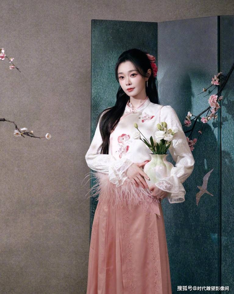 这组造型的每一处细节都藏着巧思,堪称新中式穿搭的教科书级别示范。领口的粉边盘扣精致小巧,衬着她垂落的长发,温柔感拉满;旗袍上的梅纹刺绣沾着细碎光泽,针脚细腻,仿佛能闻到梅花的清香;蕾丝袖摆轻笼着手腕,中和了传统旗袍的厚重感,添了几分现代女性的轻盈;最点睛的是腰侧那圈软绒绒的粉羽,悄悄注入一丝娇俏,让整体造型不呆板、不沉闷。背景更是氛围感拉满,墨绿屏风晕着哑光质感,旁边的纸伞、茶席错落摆放,整个场景像极了从宋词里抠出来的片段,却又因为宋轶眼尾的那点灵动感,跳出了古画的沉闷,成了传统与现代揉碎了再织就的雅致。