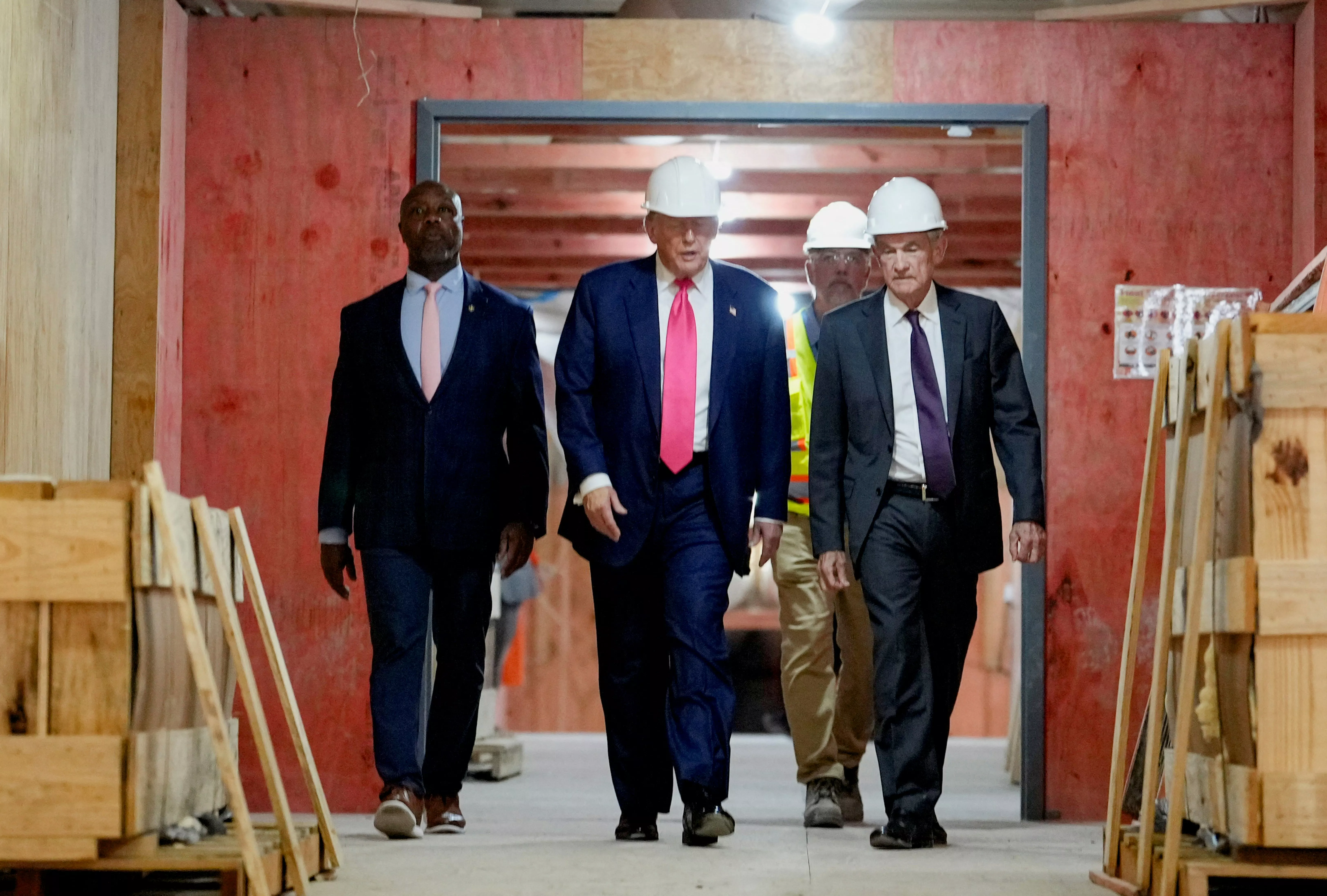 2025年7月24日,美国总统特朗普(Donald Trump)到正进行翻修的联储局视察,联储局主席鲍威尔(Jerome Powell)同行。(Reuters)