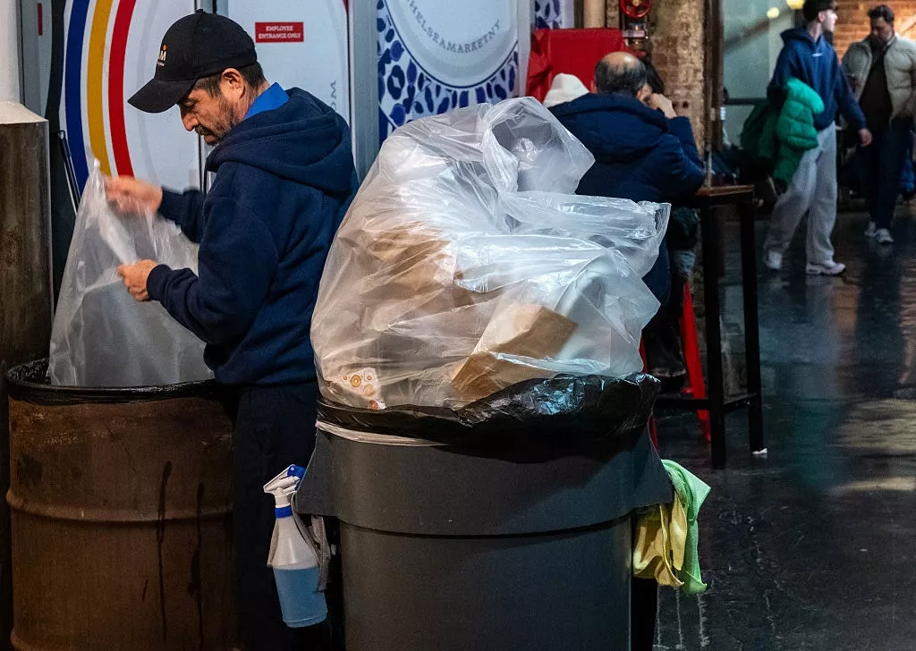 一名男子于2025年12月16日在纽约市曼哈顿处理垃圾。劳工统计局报告显示,美国经济于10月减少10.5万个就业岗位,11月增加6.4万个就业岗位,导致11月失业率攀升至4.6%,创下四年新高。(Getty)