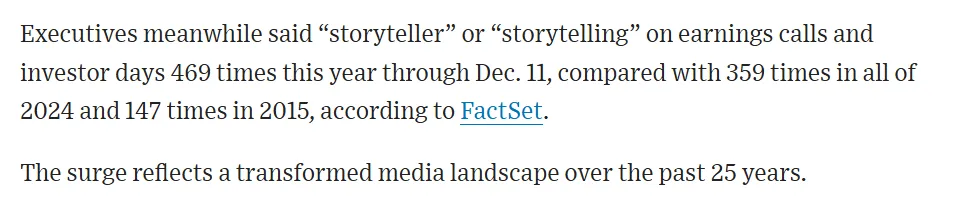 企业高管在财报电话会议、投资者日上提到storytelling的次数,更是从2015年的147次,一路涨到2025年的469次。