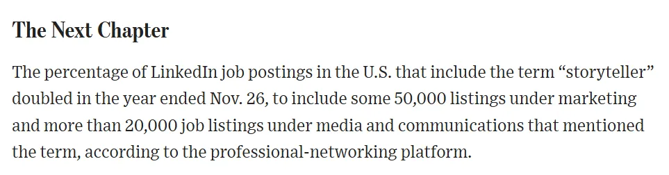 过去一年,美国LinkedIn上职位描述中包含storyteller的岗位数量翻了一倍,市场营销类岗位中有5万个提到“讲故事”,媒体与传播类岗位也超过2万个。